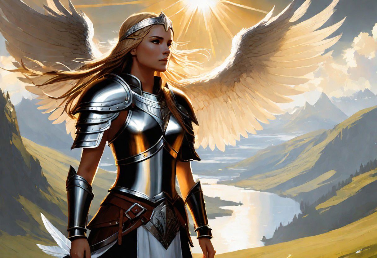 Hlif Brunidottir. Valkyrie. Wings. Armor. Female. Male. Long Hair. Landscape Background. Cloudy. Sunny.