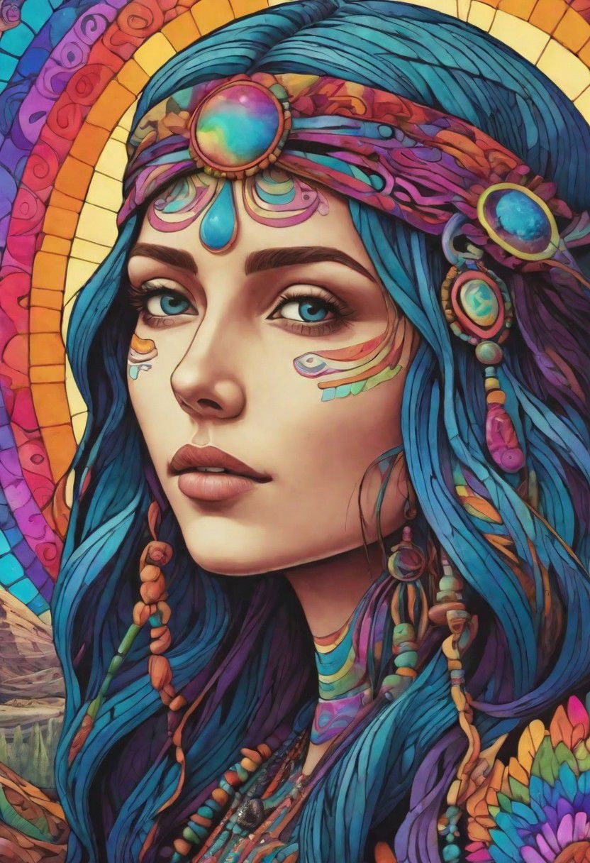 style of Amanda Sage, close-up of a psychedelic colored hippy girl, hd, 8k