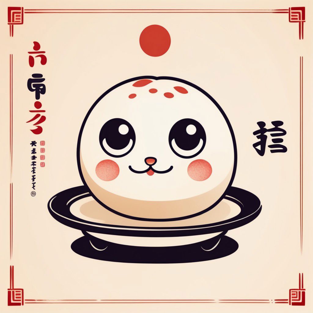 logo of japanese restaurant Mochi, Cartoon character Japanese dessert mochi with big cute eyes, around border with restaurant's name "Moti", style of Japanese ink on parchment, one color, designed by Katsushika Hokusai, minimalism