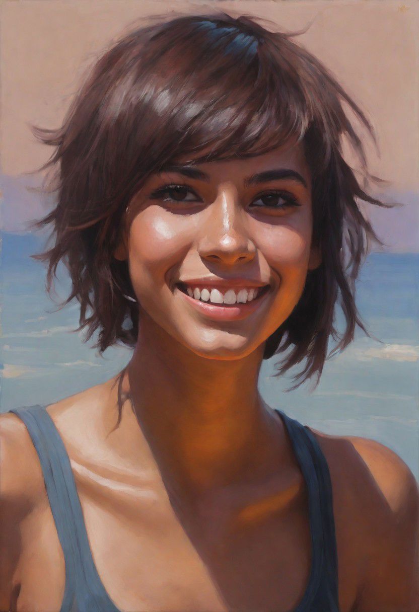 <lora:GiganticBreastsXLv1:1>, ((oil painting)), 1girl, (Short-haired busty Israeli emo-girl), tanned skin, ((translucent)), (dropped armholes), ((one exposed breast)), (side-boob), ((tubular breasts)), (((large dark areolae))), ((beautiful smile)), ((dimples)), (((colour-textured short dark pixie-cut hair))), (spine), ((arched back)), tattoo on shoulder, (tan-lines), sunny evening on plain sandy beach, Intricate textures, (high detailed skin:1.5),