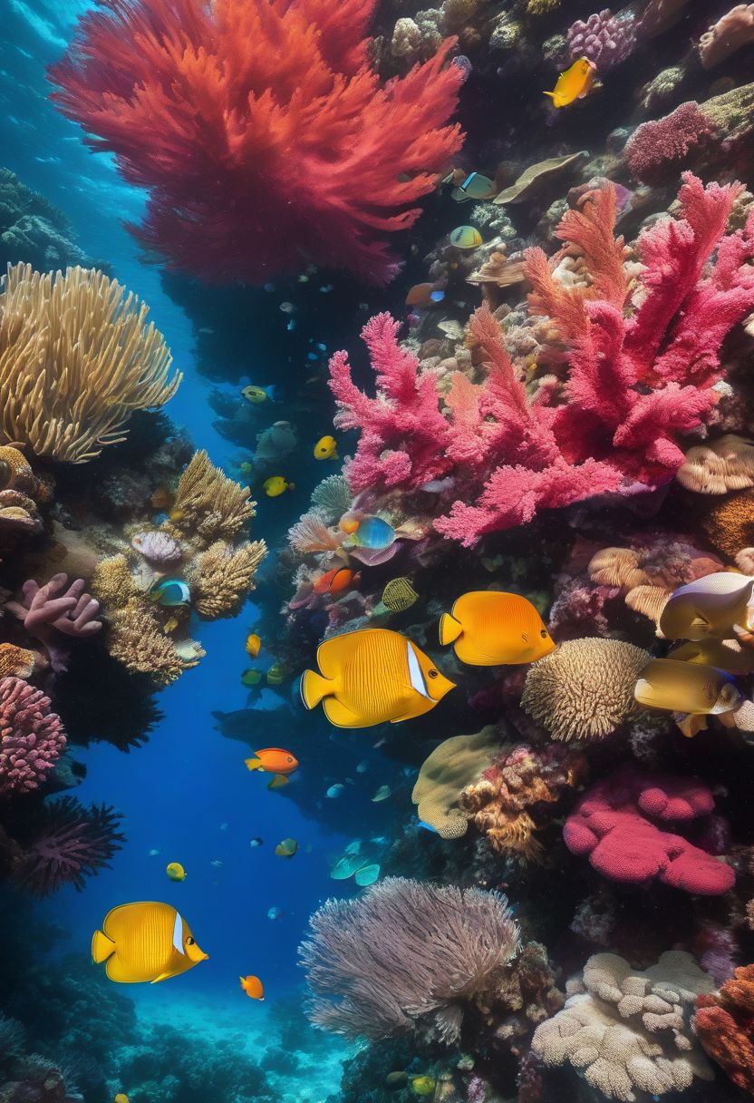 A mesmerizing underwater image of the Great Barrier Reef, showcasing the vibrant and diverse colors of the coral and marine life. The corals exhibit a myriad of hues, including red, orange, yellow, green, and blue. Fish of various shapes and sizes swim in the background, adding to the richness and beauty of the scene. The water is crystal clear, allowing the viewer to appreciate the intricate details of this natural wonder.