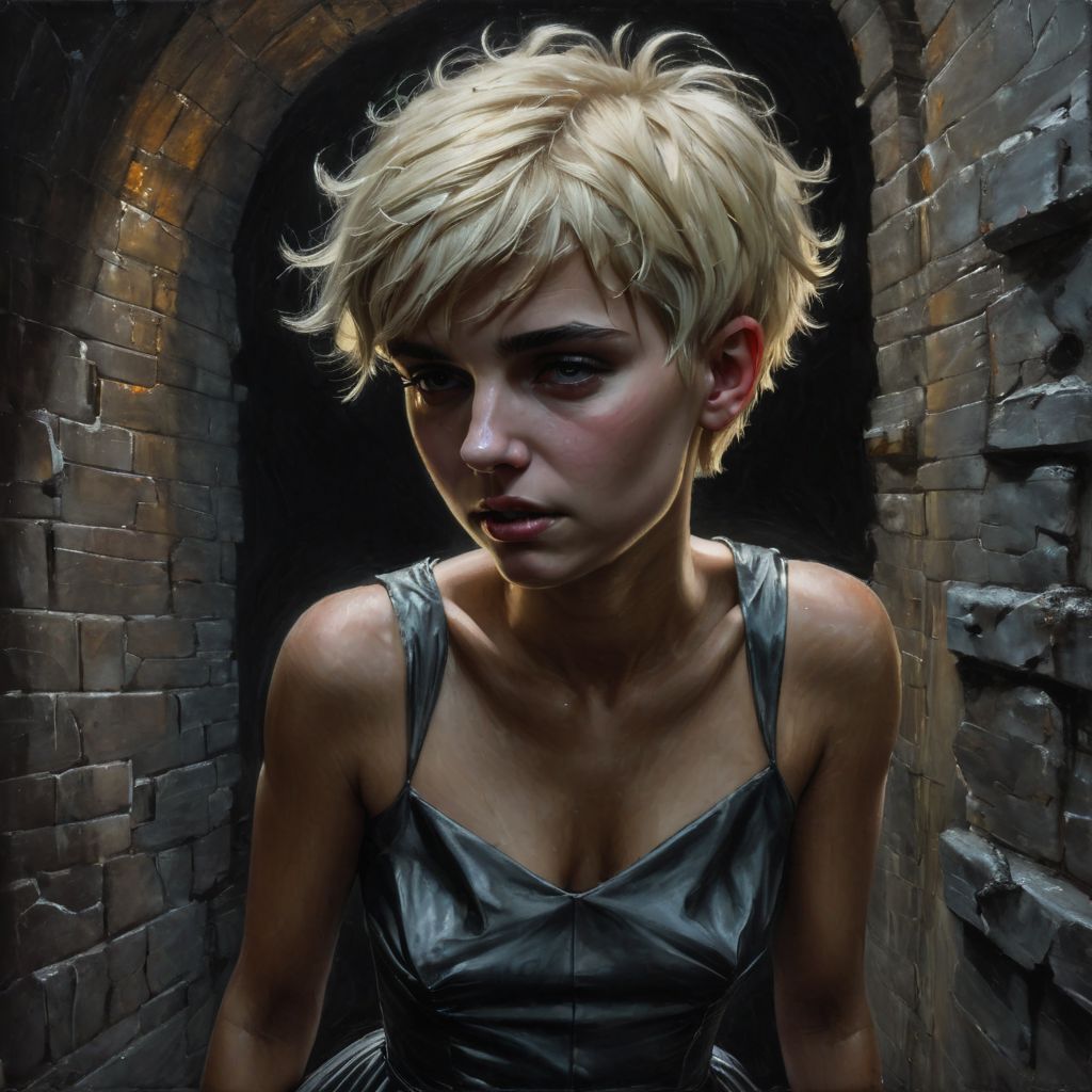 <lora:SDXL_MassiveCowsLoRA_v2E2:1> , (((classical oil painting))), ((Candid))), (((side view of cute short platinum blonde American girl standing nervously in doorway of small creepy dungeon))), ((wearing only a tiny thin prom-dress)), ((dropped armholes)), (tanned skin), (scared face), (((gelasin))), ((snub-nose)), (((hands on head))), ((teardrop boobs)), ((short messy pixie-cut hair with severe undercut)), ((large dark round areola)), (dark dirty room), ((harsh shadows)), ((neon)), Intricate textures, (high detailed skin:1.7),