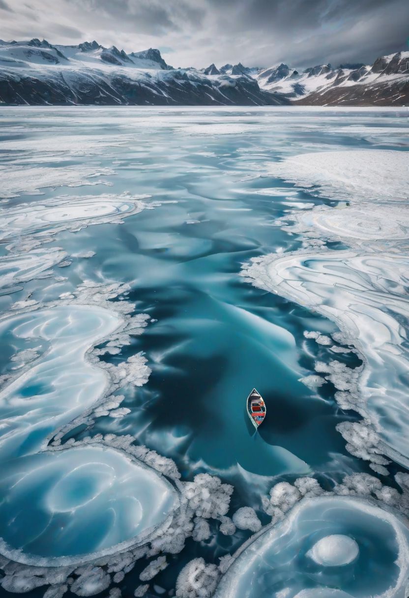 Aerial view of an ice lake with a small boat in the center, surrounded by swirling patterns andvibrant blue water. spiral abyss, The scene is captured from above in a topdown intricate details like ripples on surface and layers beneath the snowcovered out over the icy expanse. creating a sense of aweinspiring tranquility