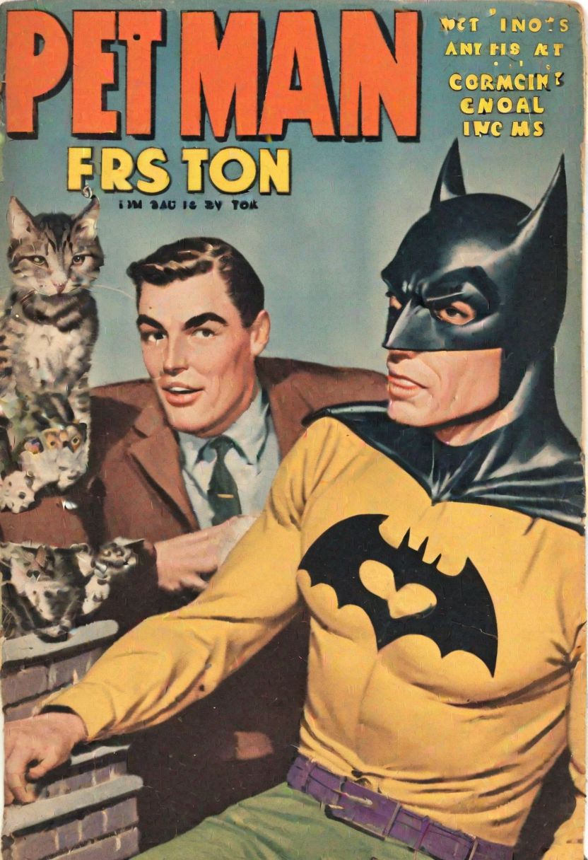 Vintage magazine with title text: ("PET MAN":1.3), (Batman stroking a cat in his lap:1.2), VintageMagStyle
