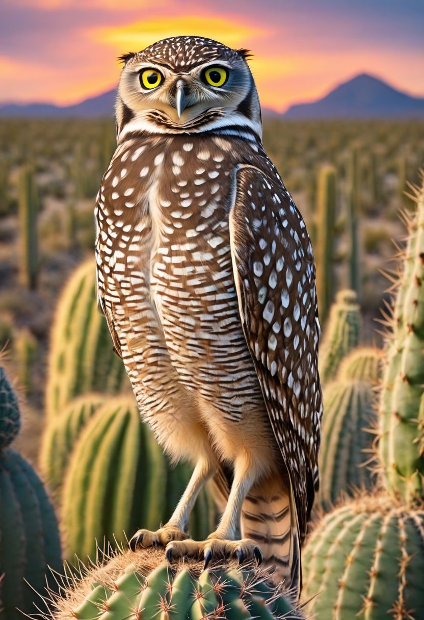 As the sun begins to set, an Burrowing Owl owl sits in a cactus with only its head out of the cactus. Very realistic photography