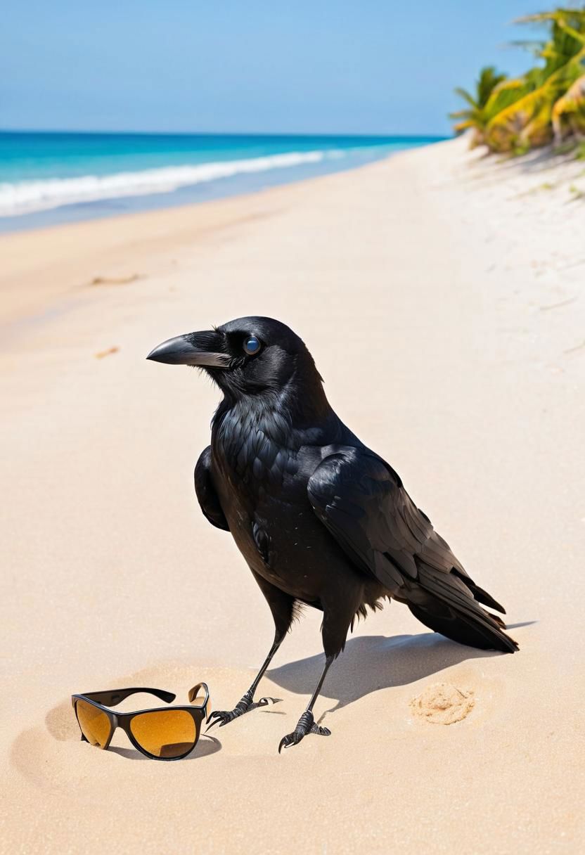 a crow on the beach with sunglasses