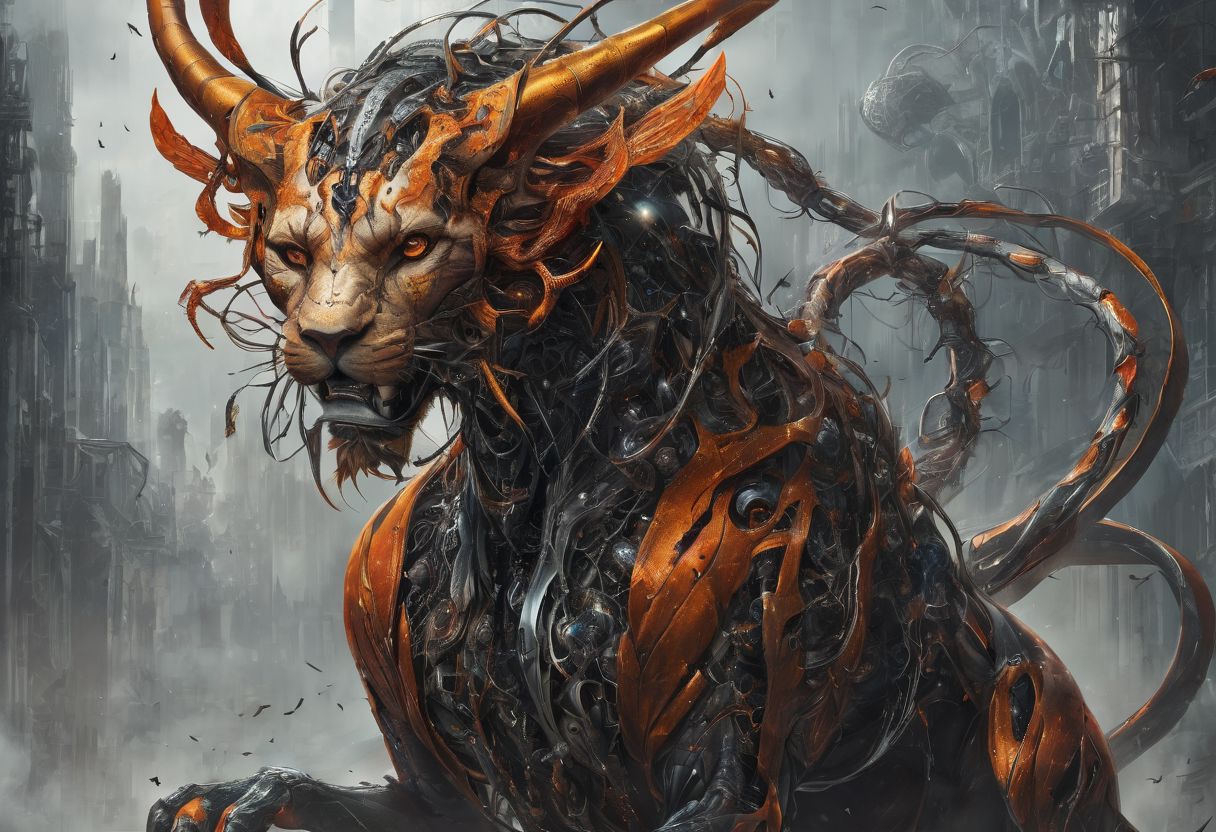 ultra-high quality, ultra-detailed image of a hybrid mechanical, hybrid creature, Fusion of snake a lion and spider, seamlessly blending mechanical and organic elements, dark and orange mysticall and vibrant colors, commanding presence, capturing her entire body, iron mechanical horns, Face: Highly detailed, lifelike features with expressive, piercing eyes that convey her strength, fierce, showing a natural blend of mechanical and organic textures, vast, desolate desert of dunes, evoking an abandoned planet, barren landscape.