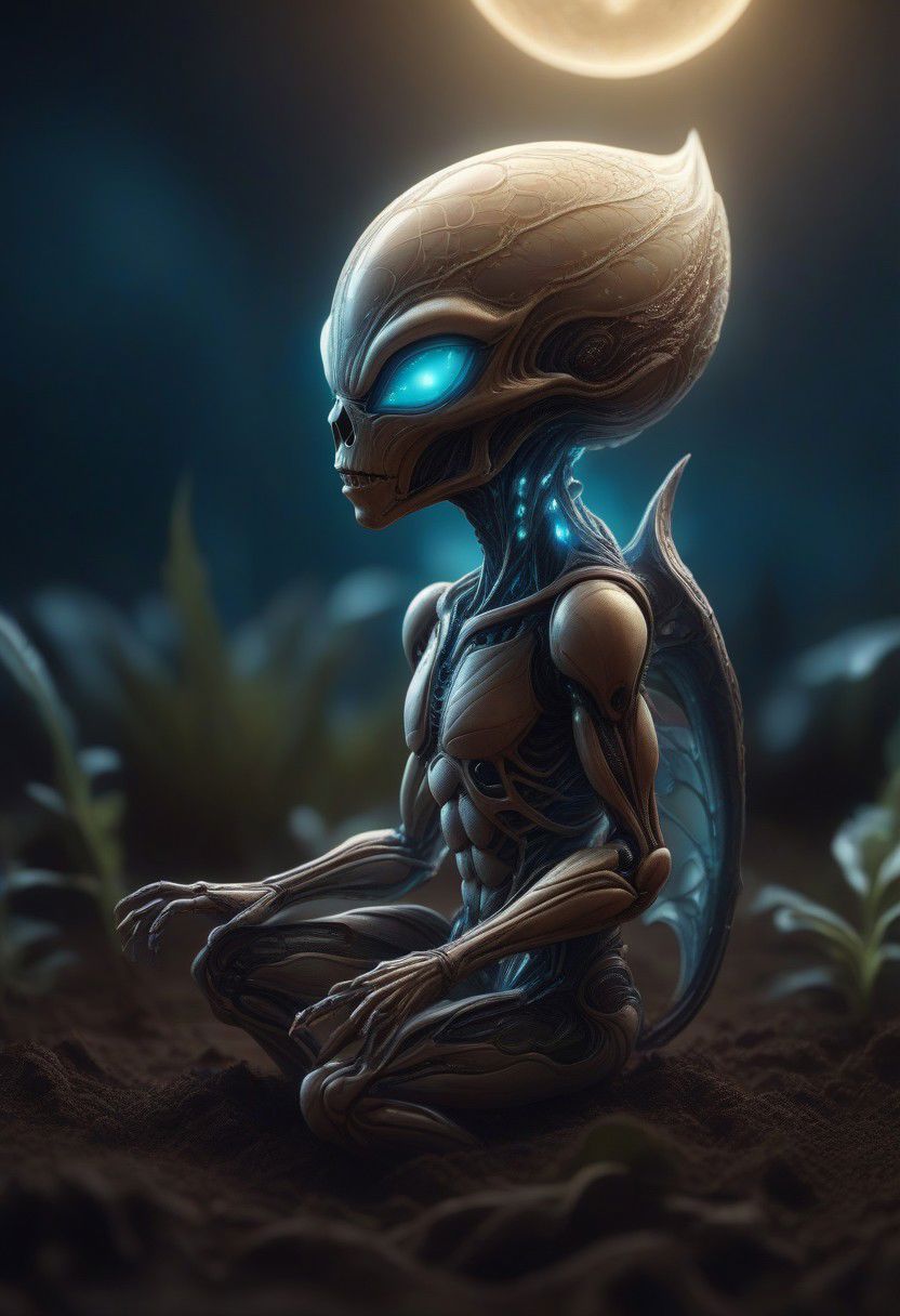 alien-themed Captured with surgical precision, the emerging alien seedling breaks through the dark soil, its textured carapace glistening with residual moisture. Root-like appendages intertwine, reaching out into the unknown, as low-key lighting casts eerie shadows, enhancing the mysterious atmosphere. Macro photography style showcases high-resolution details of this otherworldly life form, revealing the stark contrast between the damp earth and the prime lens clarity. Moisture droplets cling to the budding organism, evoking a sense of awe and curiosity. . extraterrestrial, cosmic, otherworldly, mysterious, sci-fi, highly detailed