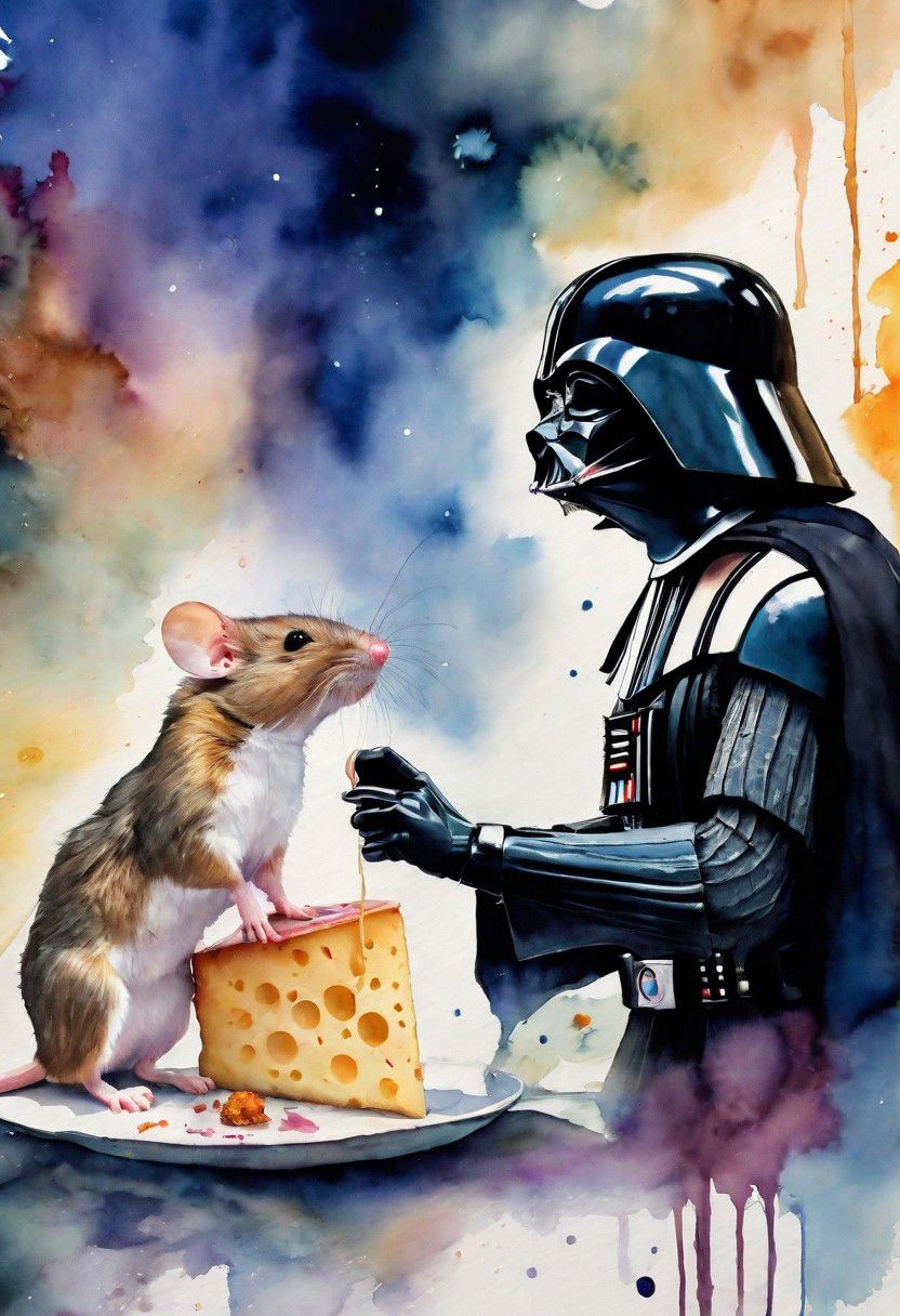 "Beautifully rendered watercolor painting of a mouse dressed as Luke Skywalker facing off with a mouse dressed as Darth Vader. A chunk of swiss cheese sits in the background. Style by JB, Waterhouse, Carne Griffiths, Minjae Lee, Ana Paula Hoppe, Stylized watercolor art, Intricate, Complex contrast, HDR, Sharp, soft Cinematic Volumetric lighting, pastel colours," Weight:1.3