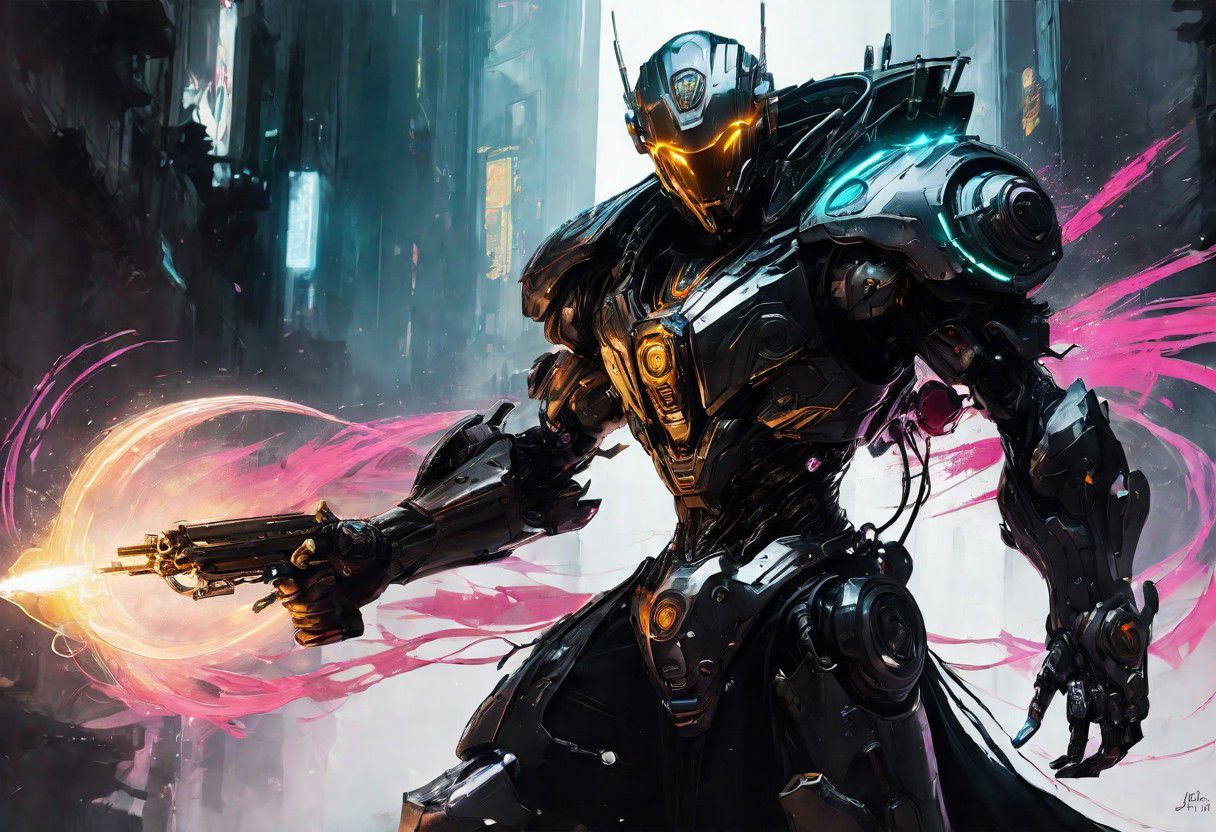 action shot, ink and watercolor by (benedick bana), (((cyberpunk, high fantasy))), a handsome rugged brawny muscular mexican cyberpriest casting a spell, early 30s, body hair, (short hair), (dark tan skin), black sleeveless robe, white cybernetics, silver trim, short beard, earrings, ((plain) silver jewelry), round face, soft facial features, (iridescent magic (swirls, effects, bloom)), outdoors, (fine, exquisite, ornate, extreme, hyper (detail)), bright color