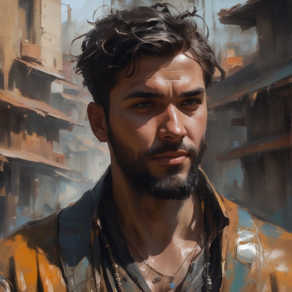 extremely detailed masterpiece (by Daniel F Gerhartz|Ian McQue|Maximilian Pirner]. smooth close-up portrait. fantasy, sci-fi, futuristic. an (extremely-muscular:1.9], attractive, manly, sexy, rugged, 28-year-old Brazilian man with a dark very short undercut (grins:1.7], daring the viewer. He sports an unshaved, perfect, stylish, short, neatly-trimmed beard, and (chest hair:1.8]. He wears a tight, collared v-neck shirt, as well as a simple necklace. He personifies mischief, danger, intrigue, mystery, and suspicion.