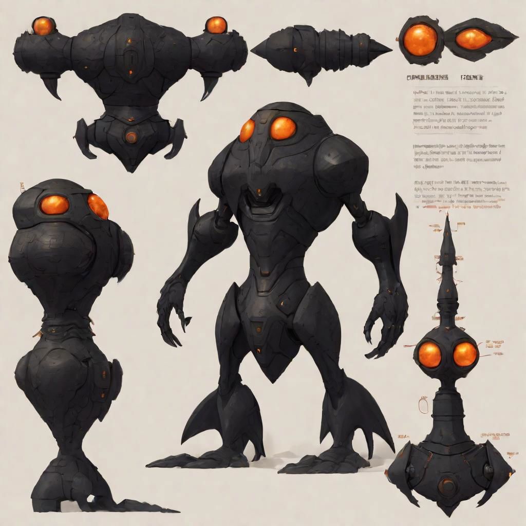 a golem-like being made entirely out of pure, solid black carbon with a body shape similar to Sylux from Metroid with pillar-like legs with pointed ends and pointed spires on his shoulders, an elongated, pointed head and a dark orange eye.