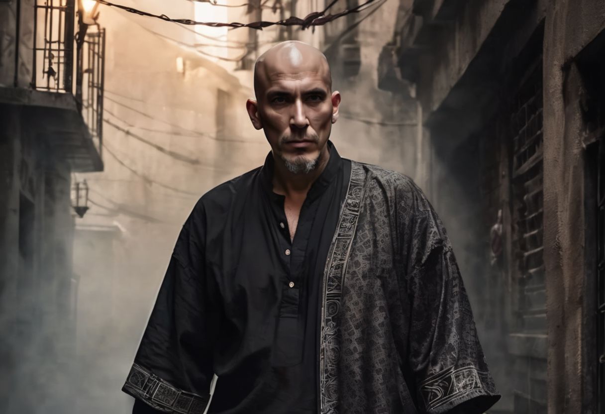 dark alley, short a middle-aged european man, shaved bald, dressed in a patterned shirt with a large neckline and wide sleeves, black trousers and soft shoes with curved toes. small knife in hand, holding knife. A thick black tattoos - an interweaving of runes and symbols – covered his entire body, except for his face. black runic tattoos, thick shadows, smoke, mist, sunset, dim light, dark background