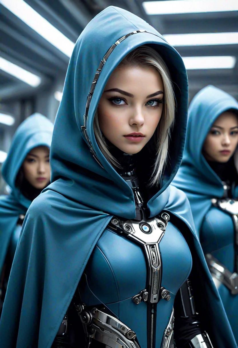score_9,score_8_up,score_7_up,rating_questionable, beautiful women 21 years old, group of women, sci-fi, androids, cyborgs, perfect body, technology, singularity, futuristic palace, high tech, wonderful, amazing, faces with metal details, cyberpunk, cult of ai and high technology, Android cultists, wearing hooded monk capes, futuristic hairstyle