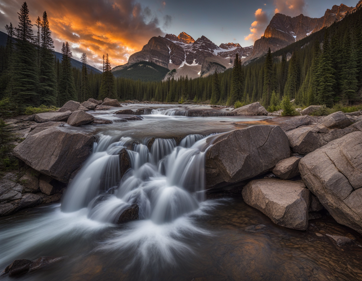 RAW, 8K, HD, Sharp Focus, landscape photography, a stunningly beautiful landscape, after sunset, photorealistic, absurdres, hyperrealistic, (crepuscular rays:0.5) the canadian rocky mountains, waterfall, award winning landscape photography, HDR