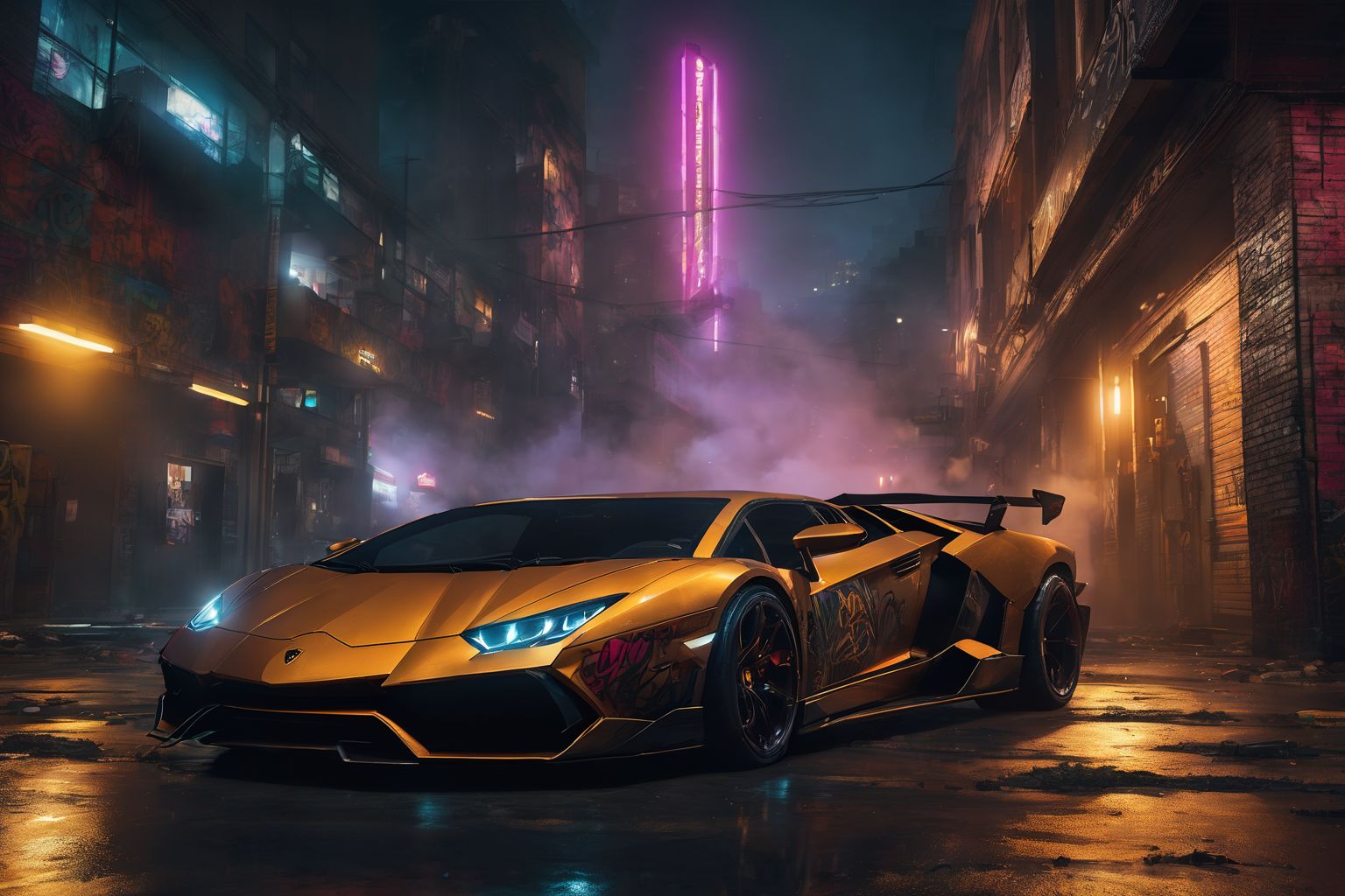 at night:1.2 cyberpunk tall building,complex lighting,((mechanical elements)),(smoke and fog:1.2),steam punk vibe,graffiti wall,metallic accessories,Lamborghini super car,wide-angle view,Cinematic Lighting,rim light,extreme.