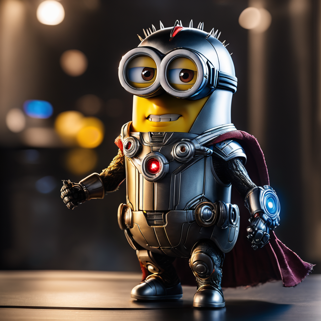 Minion in the spotlight, (wearing a Ultron cosplay:1.2). Central figure, distinct mimicry, Photorealistic, Hyperrealistic, Hyperdetailed, analog style, soft lighting, subsurface scattering, realistic, heavy shadow, masterpiece, best quality, ultra realistic, 8k, golden ratio, Intricate, High Detail, film photography, soft focus