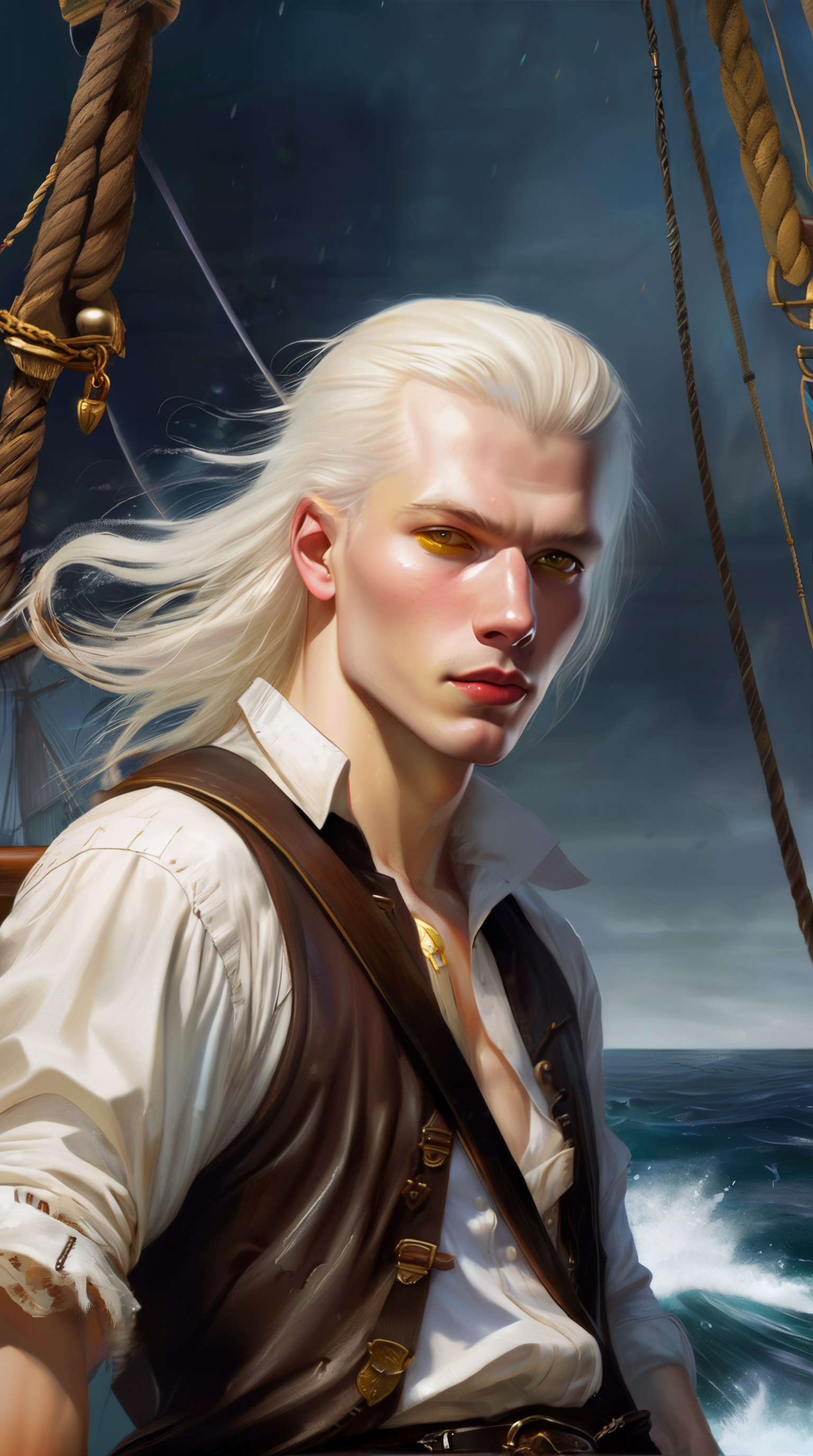 Fullbody image of an handsome 23yo albino thin young man, uriel <lora:Uriel_XL:1>, (large yellow eyes), (wild wet white hair with bangs), wearing torn and ripped open white shirt, leather pirate boots with buckles, brandishing a sword, hanging from the top of a large pirate ship with a Jolly roger