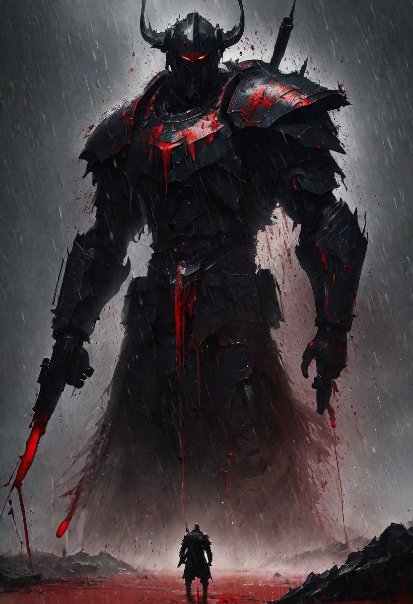 a defeated war god, fallen god, gloom, dark theme, dark fantasy, dark color scheme, illustration, red paint scattered, black paint scattered, dark blue paint scattered, looking up, raining, red rain, blood, lots of bodies, (battlefield:1.2)