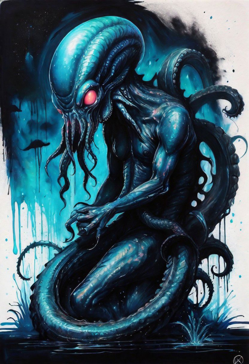 Alien and Kraken, Scaly, Tattoo Painting, Dripping Painting, Tattoo design, Midnight, Bioluminescence, Gothic Dark Palette