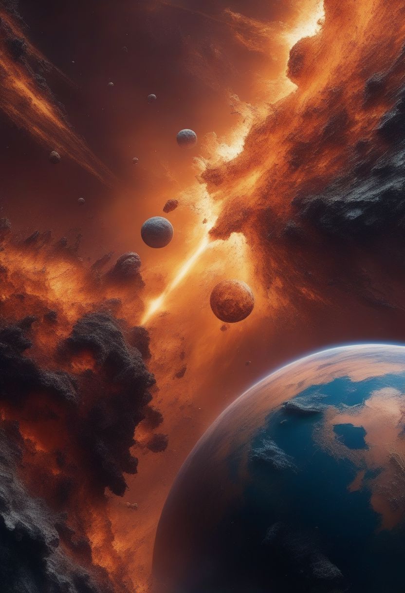 ultra realistic (close up photo:1.5) taken through the collision zone during (two gigantic planet are about to collide each other:1.8), impact, hyper realistic, close up, a chaotic state of atmospheres, explosions, mountains collapse, oceans splash, cinematographic , dispersin parts of planets in to space.