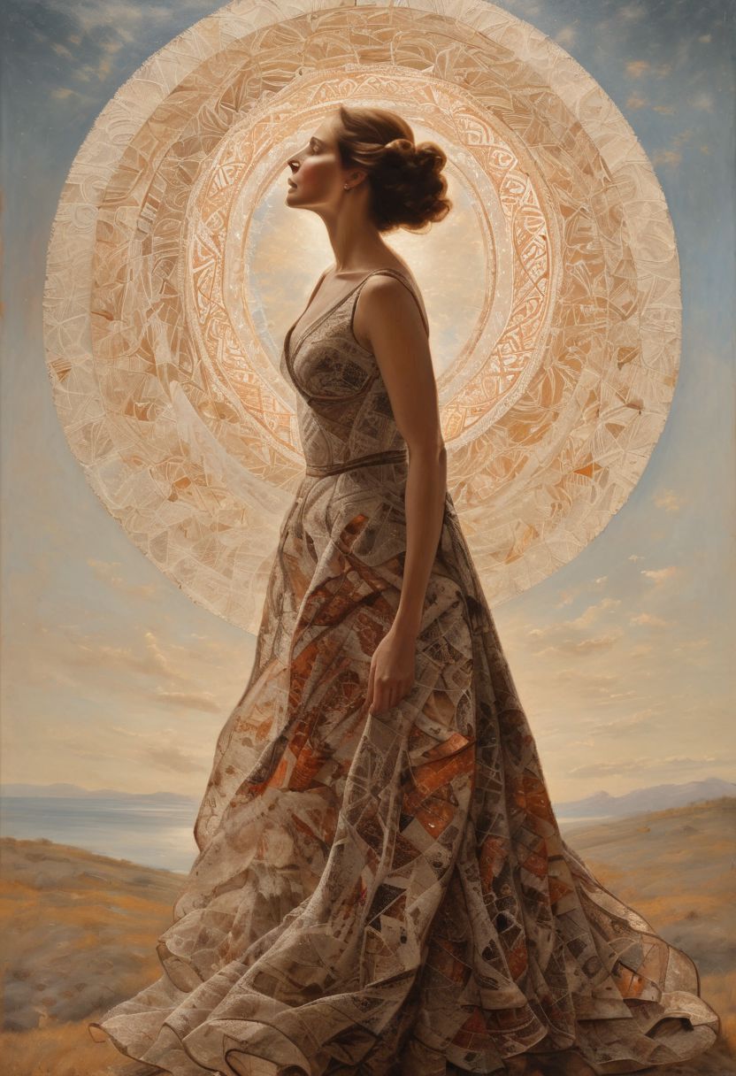 In this surreal masterpiece, a visionary artist depicts an ethereal Caucasian woman, aged 45, adorned in patterns reminiscent of ancient Greek motifs, resembling a long lace dress lifting towards the sky. The unconventional medium involves broad strokes, drips, and dusting of colors on old postcards, creating a textured tapestry that weaves through time. The aged postcards serve as both canvas and narrative, linking the contemporary with the historical in a poetic dance. The patterns delicately intertwine with the woman's body, celebrating cultural heritage, while the inspirational light emanating from her symbolizes internal beauty. The interplay of light and shadow accentuates her contours, creating a dynamic visual experience. The chosen color palette, a harmonious symphony of muted tones, adds to the vintage allure, suggesting the fluidity of life experiences. This surrealist masterpiece challenges artistic norms, inviting contemplation on personal and cultural histories, the celebration of maturity, and the transformative power of imagination an artwork of incomparable value, transcending boundaries and evoking a timeless narrative.
