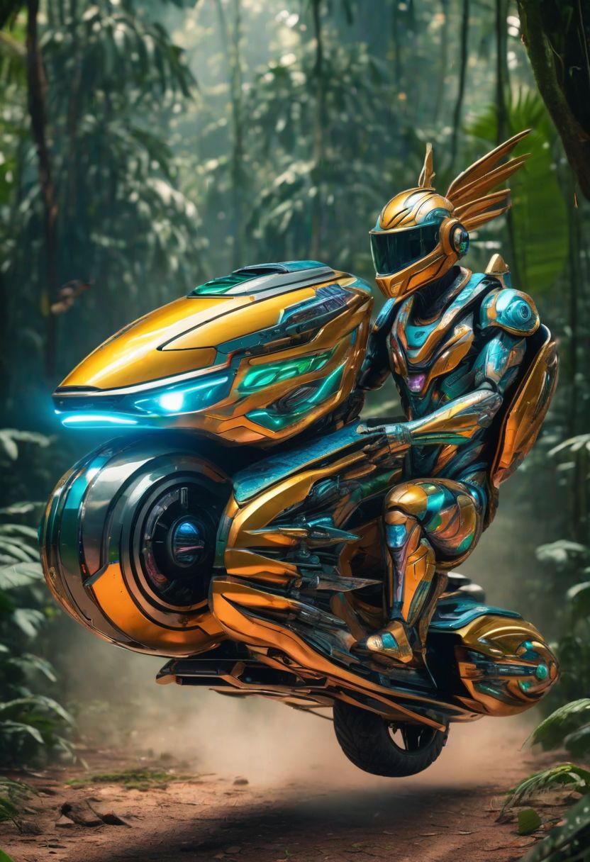 Brazilian style, futuristic hover bike with carnival-inspired colors and patterns, vivacity, ((soaring over the Amazon rainforest)), highly detailed, 8k sharp focus, full wide photo shot, ultra photorealistic