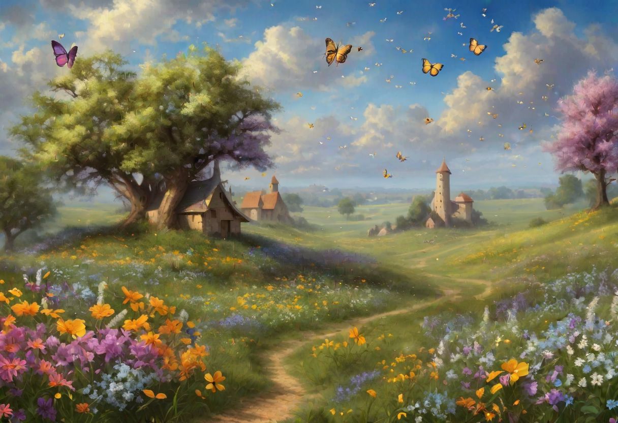 Plains with blooming flowers, trees with beehives, bees, butterflies, spring, medieval, fantasy, digital art