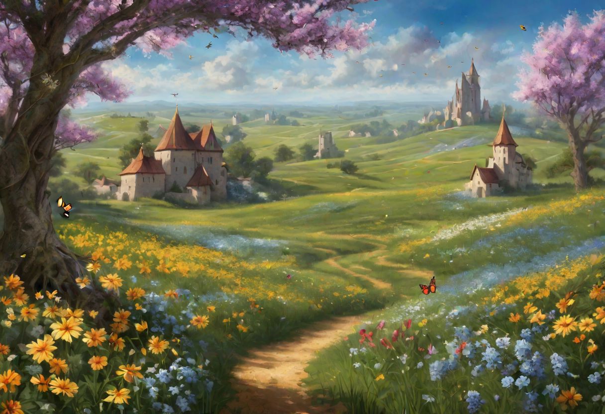 Plains with blooming flowers, trees with beehives, bees, butterflies, spring, medieval, fantasy, digital art