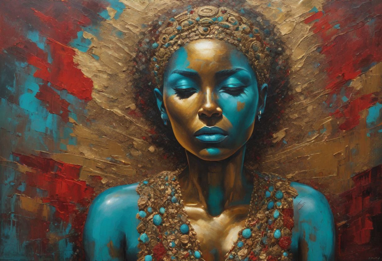 a striking, highly detailed acrylic figure painting on canvas: exploring the human condition with a stone cold heart. Earth-tones, gold, red, and turquoise color palette, emotional depth, dynamic composition, dramatic lighting, contemporary art, intricate brushwork, thought-provoking, evocative, soul-stirring
