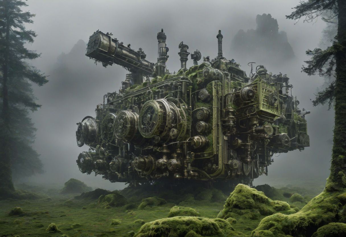 Under the misty rainfall on a vast moss-covered plain, a massive mechanical machine lumbers across a grid. The scene is captured with distorted gravitational lensing, adding a surreal element to the image. The machine itself is a marvel of engineering, with intricate gears and pistons gleaming through the mist. The mossy landscape provides a stark contrast to the cold, metallic behemoth, creating a visually striking composition. This high-quality image evokes a sense of mystery and industrial beauty.