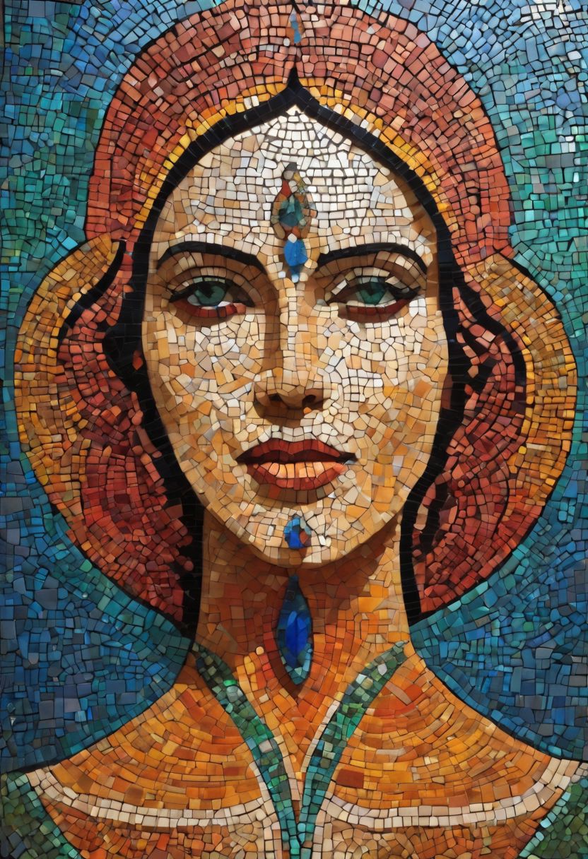 A mosaic of elongated stones in vibrant colors such as blue, orange, red, yellow, and green creates a silhouette of a beautiful full size female body waving. beautiful face, 2D, 8k, extremely high resolution, highly detailed