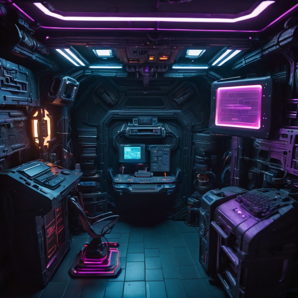 spaceship, cyberpunk, computer, gaming room, ham radio, 3d printer, high detail, 8k