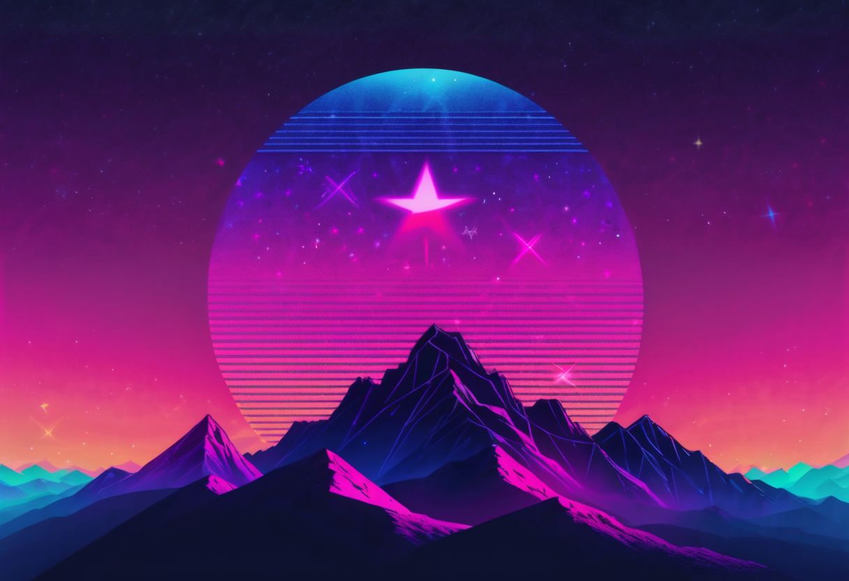 mountains made of stars, retrowave style, asymmetrical, large retrowave sun in background