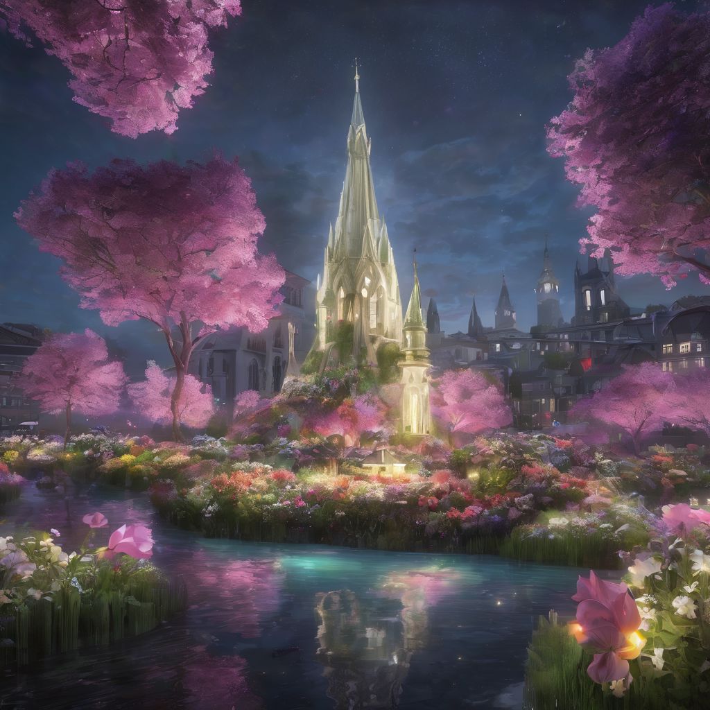 Floating garden with glowing flowers in full bloom, large spire in the background radiating light