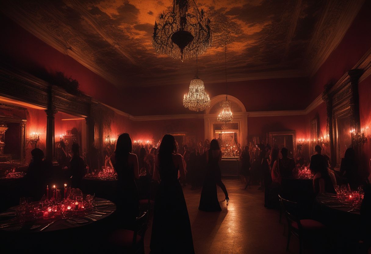 A vibrant Ibiza party scene filled with glamorous girls in high heels, set against the backdrop of a haunted mansion, capturing the lively and luxurious ambiance, high-energy party atmosphere, stylish and fashionable girls in high heels, haunted mansion adding a touch of mystery and intrigue, contrasting elements of fun and spookiness, visual feast of party glamour and eerie mansion, artwork capturing the essence of Ibiza nightlife and haunted allure, trending on social media, Intricate, High Detail, Sharp focus, dynamic, fashionable, photorealistic artwork by top artists in the party and haunted themes; horror scene, knife, dark rooms, glowing eyes, girl, kitchen, gore