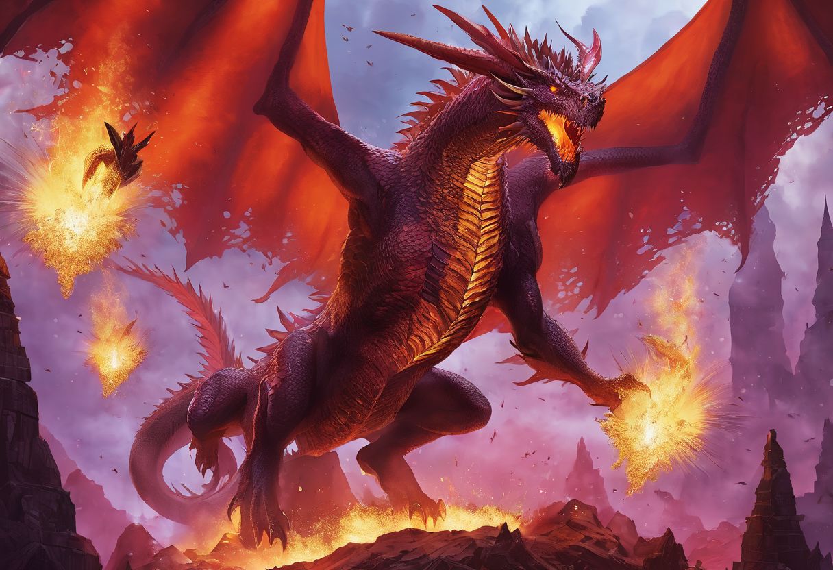 Red dragon, wings up, breathing fire, laying on a pile of gold, cavern lair, (being attacked by DnD party), hd, high resolution, 4k, 8k, masterpiece, fantasy art, classic art, majestic, scary, dynamic angle, detailed, artwork, Detailed Illustration, intricate detail, cinematic lighting, amazing quality, perfect shading, classic dragon,