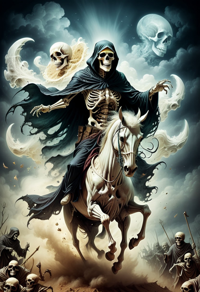 Double Exposure: The spectre of death, the grim reaper riding on his pale horse, forming a huge cloud of ghostlike dust as he charges through touching those he passes with his pale finger. A massive cloud of skeletal dust and undead skeletons and zombies form the backdrop, with a slapchop style. Intricate detail. Cloak tattered and flapping in wind. Background: moonlit sky