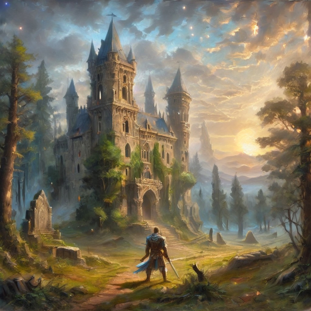 Landscape, dense forest grove, sword in stone, rose growing around sword, evergreen trees, ancient ruins in the distance Sword in stone, mystical, golden handle and hilt Twilight, stars, semi realistic, serene ambience, oil painting