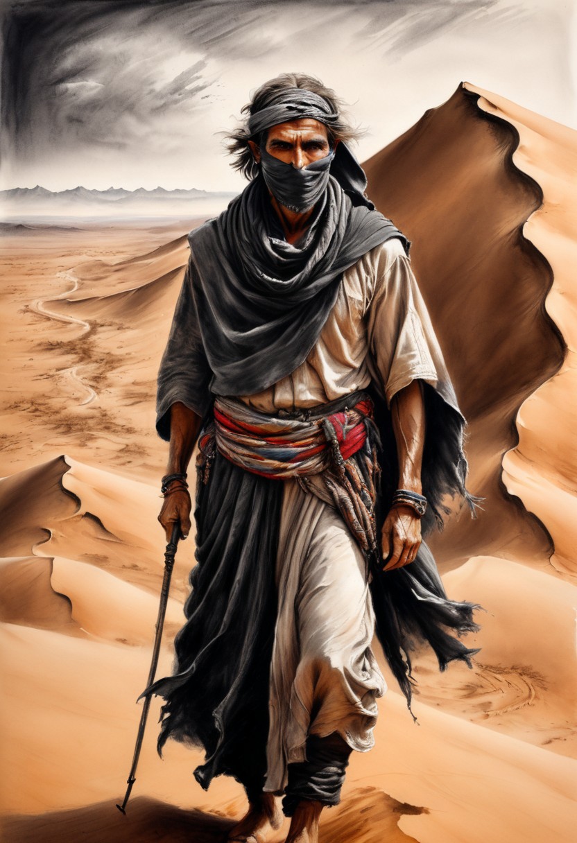 Charcoal Drawing of Desert Nomad, Rugged nomad in flowing robes, face partially covered with a scarf, standing on a dune with a vast desert landscape. Holding a staff with talismans, sharp eyes, falcon on his shoulder. Emphasize textures and details, capturing the desert's stark beauty in expressive charcoal strokes.
