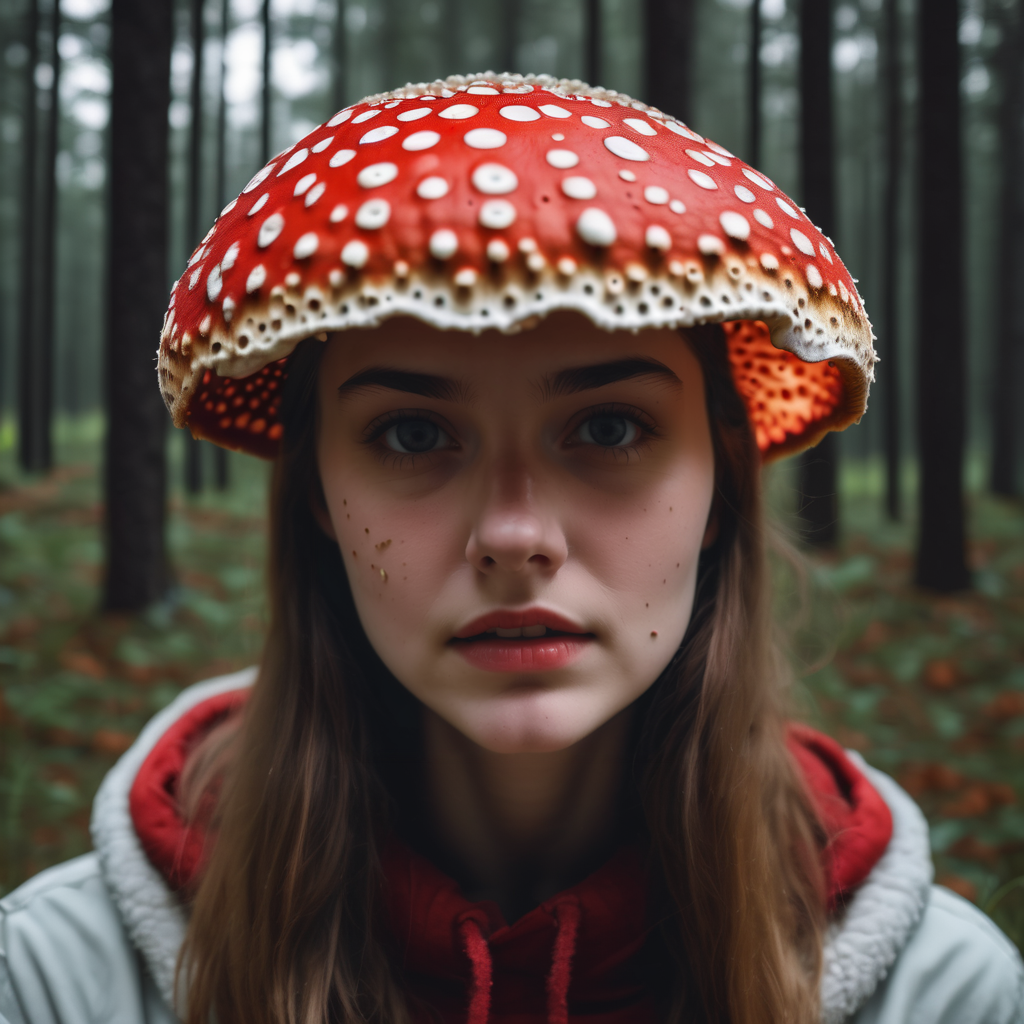 girl turns into an amanita muscaria mushroom, raw photo, 8k