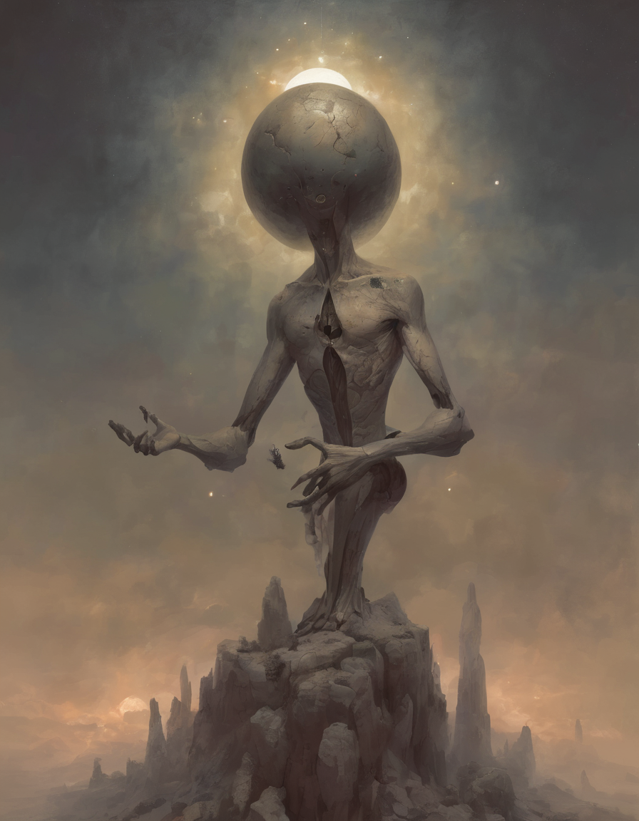 <lora:ptm0-000007:0.8>ptm0 a painting of a man with a head made out of a half moon three pointed stone with floating orbs levitating around him pressing his palms together with thin insect like body made out of thin flexible rocks, muted colors, light shining from behind, abstract, surreal, beksinkski, horror, dark art, floating in the air, Bastien L. Deharme, magic the gathering artwork, an ultrafine detailed painting, altermodern