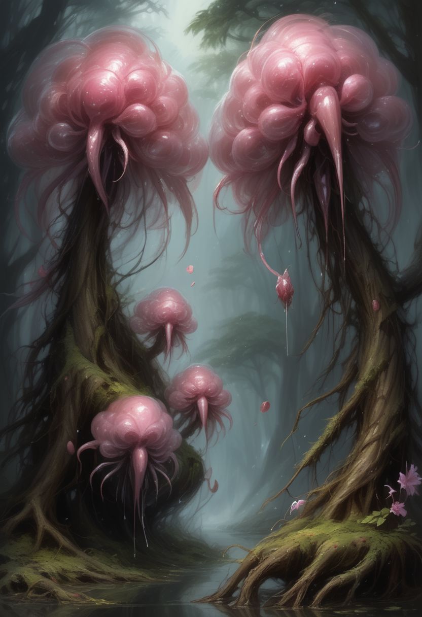 , famous artwork (by ruan jia:1.4), detailed expressive eyes, fantasy style, the mysterious lop-eared chumblegrabble, a wakthurbled monster ermerging from the depths of the misty jinxflagranti swamps of planet dorfshnupf v, shown here with its lampremblative wings glistening in the moonlight as it grimmzles, twisting trees and zoggling the will-o'-the-wisps in its vicinity BREAK medium-sized champagne scrambling toothed plant, cracked texture off-centered woody stem, knobby, bipinnately-cleft veined leaf, penninerved venation, spiral, serrulate leaf margin, orchid compound umbel tubular flower, lanceolate, pink aggregate fruit fruit, rugged, involucre, whorled phyllotaxy, creeping root