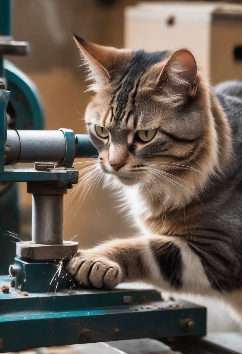 cat sharpens claws on a grinding machine, aggressive look, looks right through