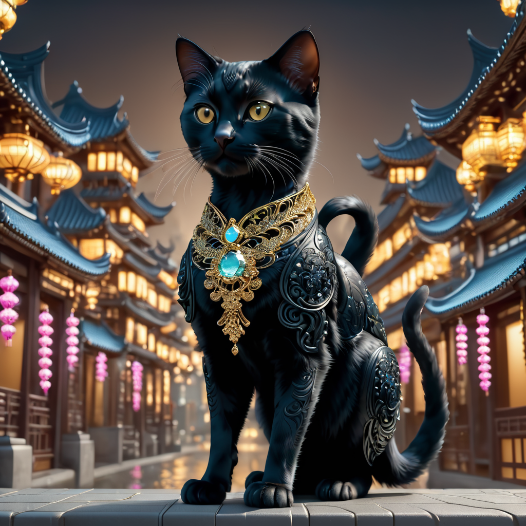 art by mooncryptowow 3d render of a fancy black chinese kitten, cute, elegant, aloof, jewels, on a chinese city street at night, intricately detailed background, sharp focus, 8k render, masterpiece . award-winning, professional, highly detailed <lora:wowifierXL:1>