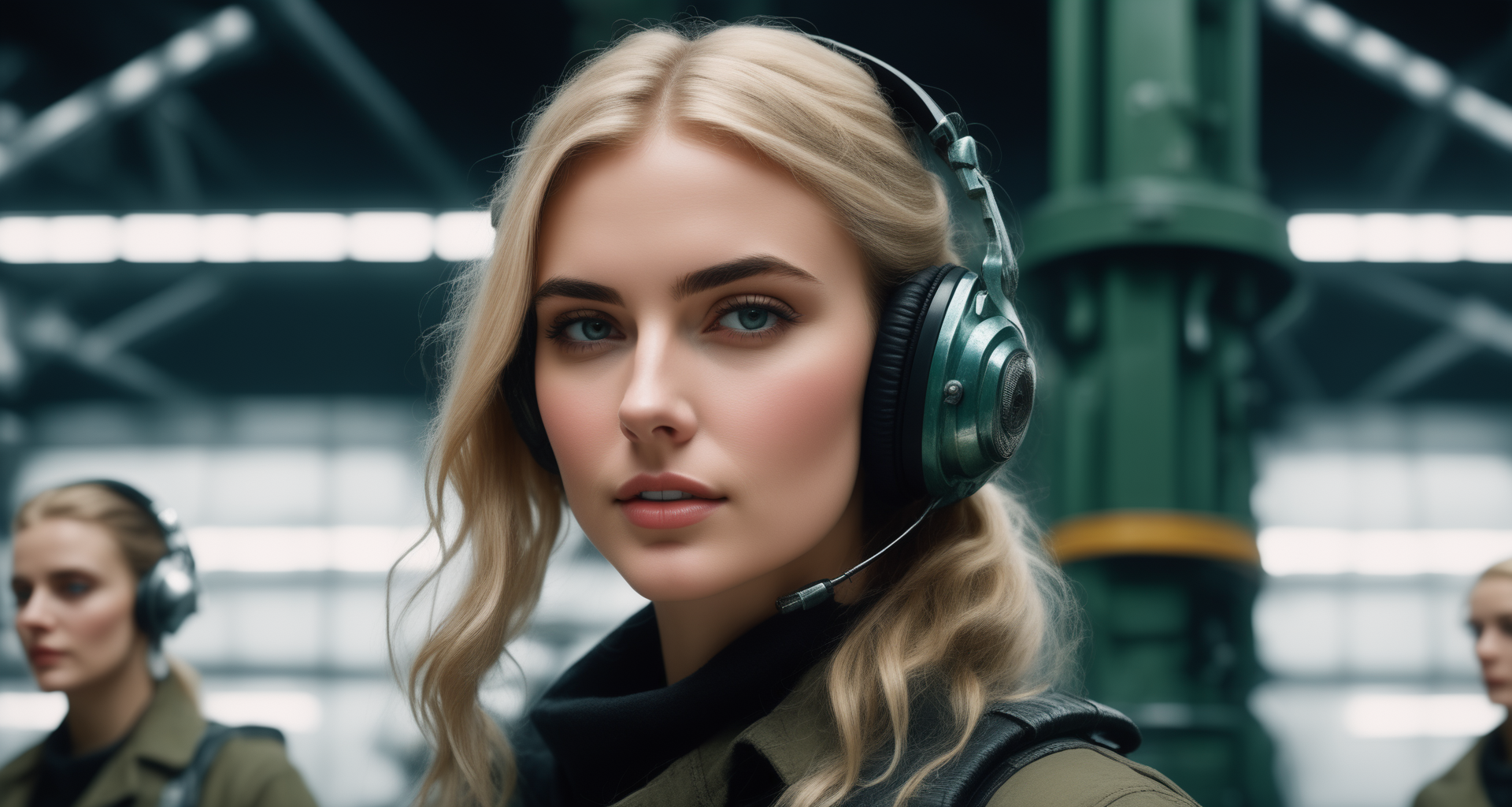 Sovietpunk reality, retrofuturism, high detailed, intricate details, 8K, ultra sharp, realistic, detailed sharp background, control panel, retro brutal industrial military machines, huge handles, gates, factory, beautiful young engineer woman do her job in crowded hangar, dark green and blonde colored hair, three-quarter view upper body mid-range portrait, old headphones, FEMININE,PERFECT SEXY FACE,ARTIST, OIL PAINTING, SMALL BREASTS,TONED ABS,THICK THIGH,EVOCATIVE POSE, SMIRK, skin texture, cinematic soft light, 28mm