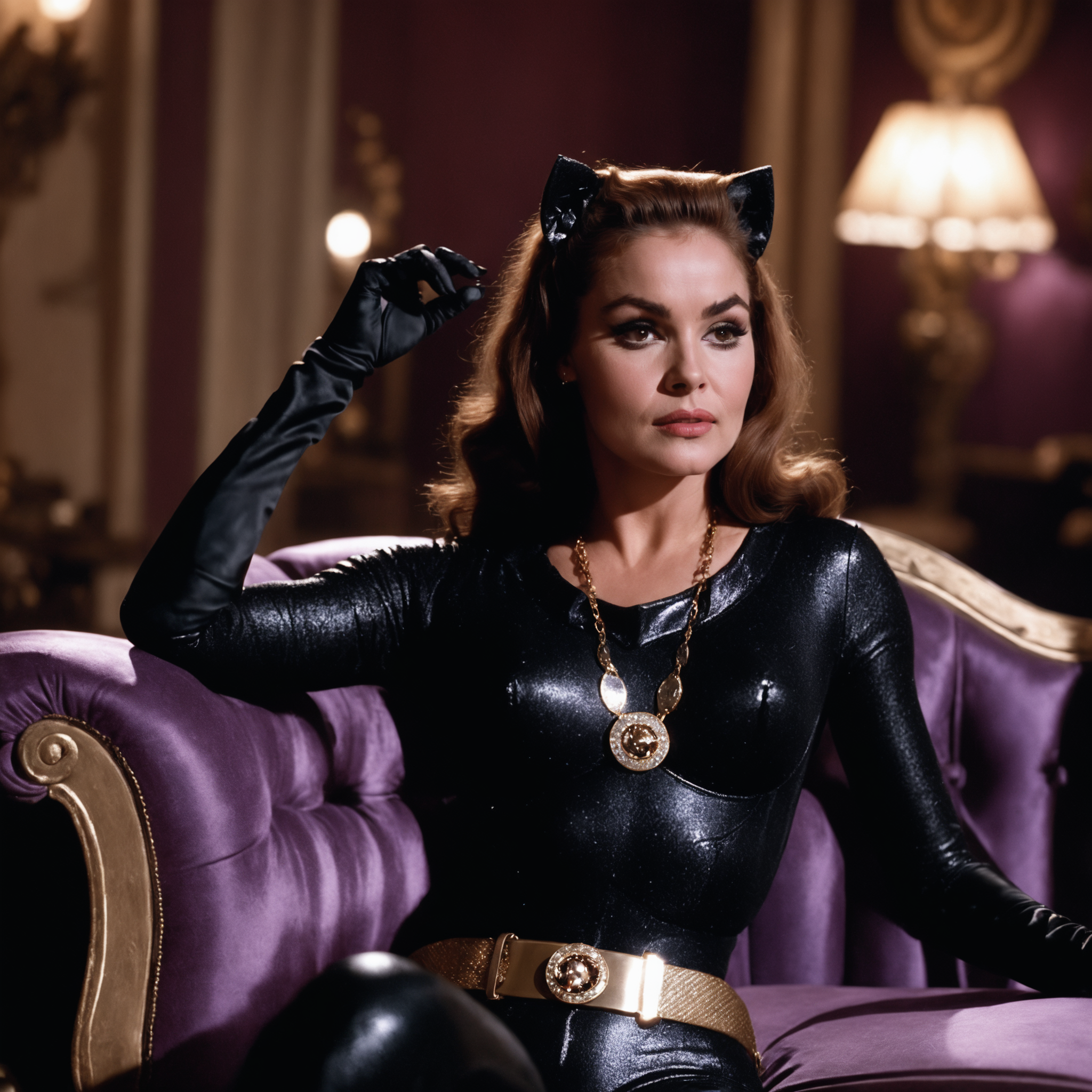 cinematic film still long shot, catwoman woman, bodysuit, belt, jewerly, laying on top of 1960s \(style\) vintage purple couch, backlground of vintage room, nightime <lora:catwoman12GB-000006:0.6> . shallow depth of field, highly detailed, high budget Hollywood movie, bokeh, cinemascope, moody, epic, gorgeous, film grain