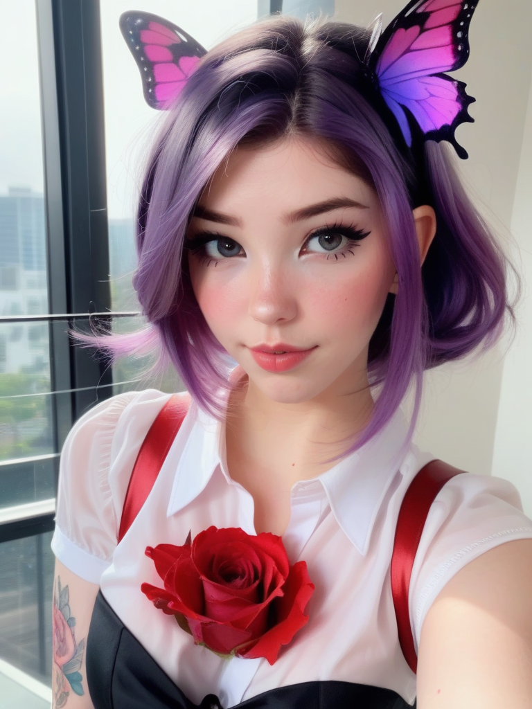 1girl, solo, masterpiece, a beautiful woman, 20-year-old woman, intricate details, realistic, blurry background, focus, lighting, cinematic, closeup, detailed eyes, shiny hair, shiny, shiny skin, shiny clothes, purple hair, cat ears, purple eyes, black skirt, white shirt, red tie, tattoos, freckles, butterflies, roses <lora:DI_belle_delphine_sdxl_v1:1> Belle Delphine