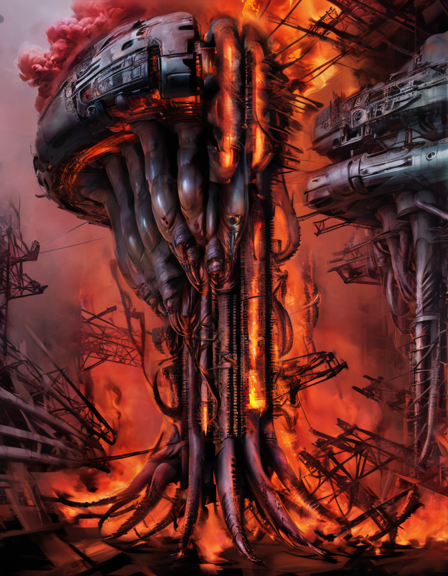 <lora:dand:0.8>dand, alien structure, fire, mechanical tentacles hyperdigital art, glitched out