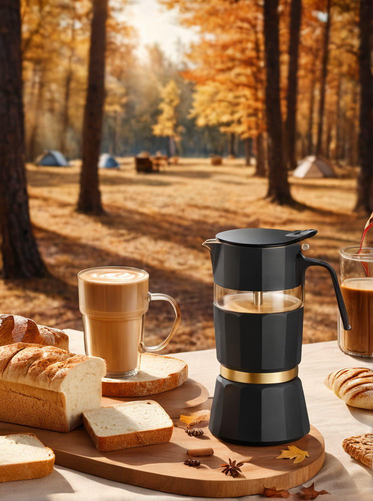 dianshang, BOTTLE, camping,bread,latte,tablecloth, blurry background ,forest ,autumn